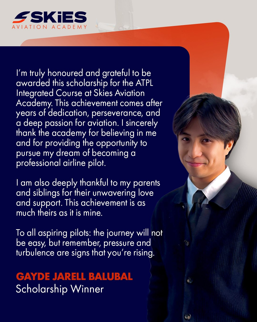 Today, we proudly celebrate the journey of our March 2026 Scholarship winner, Philippinian Gayde Jarell Balubal, whose dedication, perseverance and love for aviation have transformed aspiration into achievement.