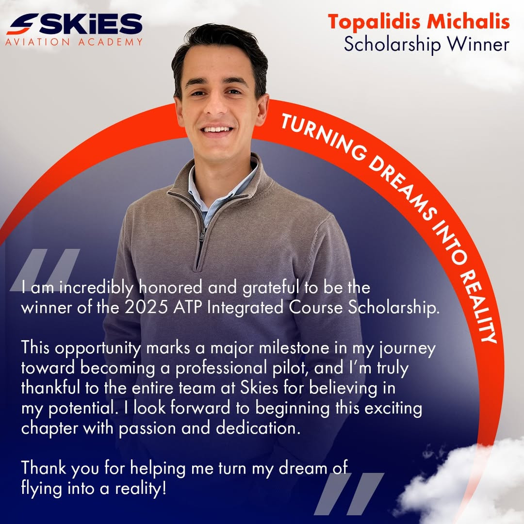 We’re proud to celebrate the winner of the 2025 ATP Integrated Course Scholarship Michalis Topalidis, a talented and passionate future pilot who embodies the spirit of determination and excellence we value at Skies Aviation Academy. Our Scholarship Program isn’t just about financial support, it’s about recognizing passion, hard work, and determination. Moments like this remind us why we do what we do, helping future aviators turn their dreams into achievements, and their goals into reality. Congratulations on this well-deserved achievement. The sky is only the beginning!